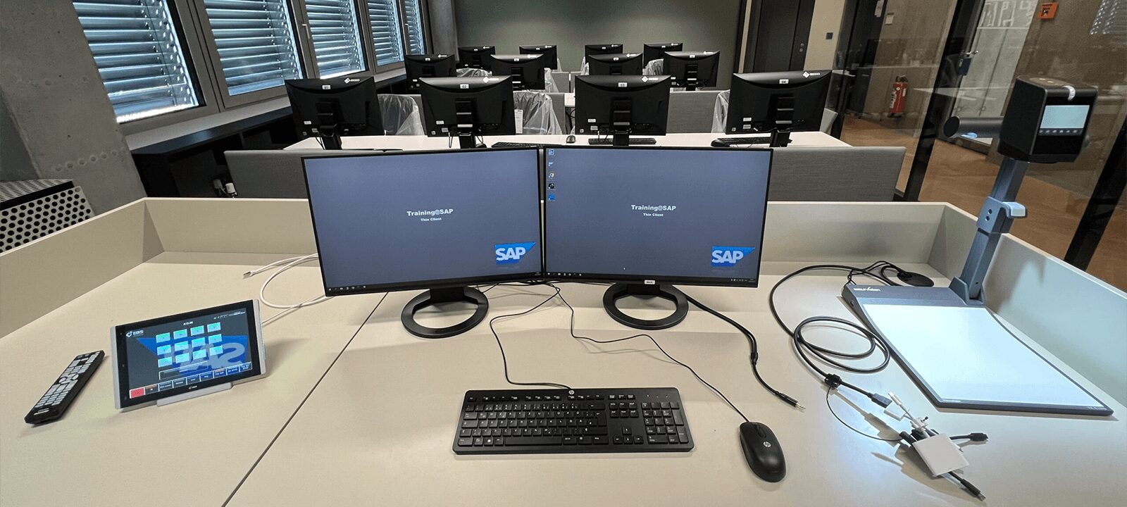 Arbeitsplätze im SAP-Raum mit synchron geschalteten Monitoren, gesteuert durch das Alphadidact-System.