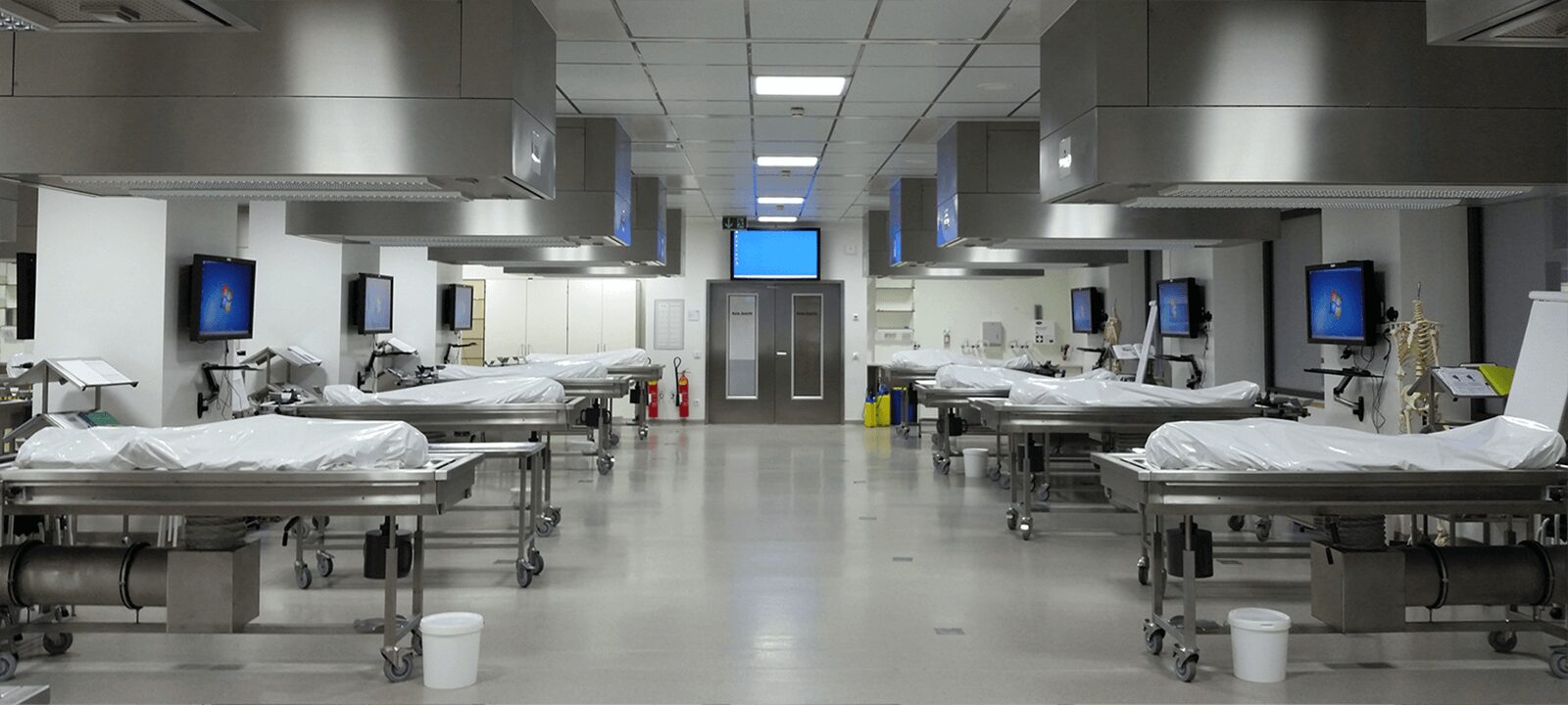 Anatomie-Schulungslabor mit Tischen beidseitig eines Mittelgangs und Monitoren, verbunden mit dem Alphadidact Schulungssystem.